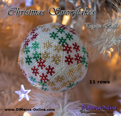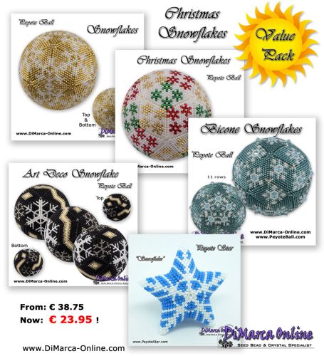 This beading pattern provides colour diagrams and word charts to create 1 CHRISTMAS 3D Peyote Star (Snow Flake) and 4 CHRISTMAS 3D Peyote Balls (Snowflakes, Christmas Snowflakes, Bicone Snowflakes and Art Deco Snowflakes).