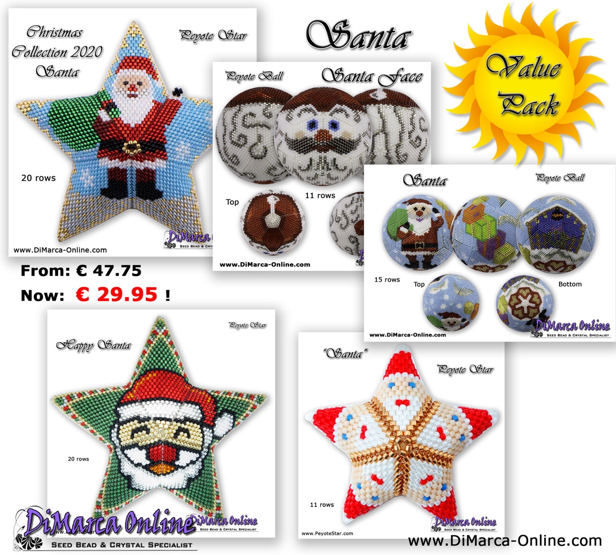This beading pattern provides colour diagrams and word charts to create 3 CHRISTMAS 3D Peyote Stars (Christmas Collection 2020 Santa, Santa and Happy Santa) and 2 CHRISTMAS 3D Peyote Balls (Santa and Santa Face).