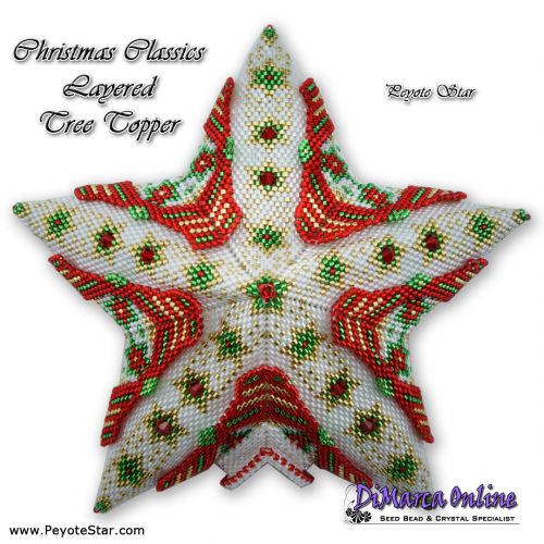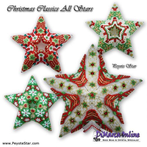 This beading pattern provides a colour diagram and word chart to create the 4 CHRISTMAS CLASSICS Peyote Stars: Christmas Classics 1, 2 and 3 and the Christmas Classics Layered Tree Topper Peyote Star.
