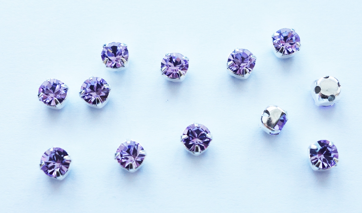 4 mm Preciosa Crystal Chatons in Setting/Chatons Montees. Crystal foil-backed chatons mounted in a metal setting with four holes on the back, 1 on each side. These are sew-on chatons. You can use them for embellishing or string them as a double-drilled bead. This is crystal of the highest quality.