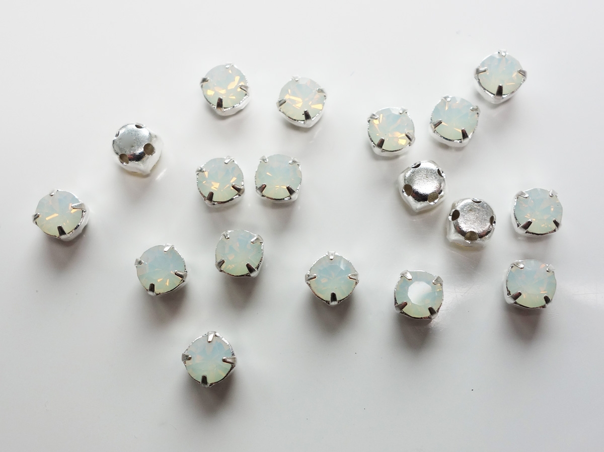 4 mm Preciosa Crystal Chatons in Setting/Chatons Montees. Crystal foil-backed chatons mounted in a metal setting with four holes on the back, 1 on each side. These are sew-on chatons. You can use them for embellishing or string them as a double-drilled bead. This is crystal of the highest quality.