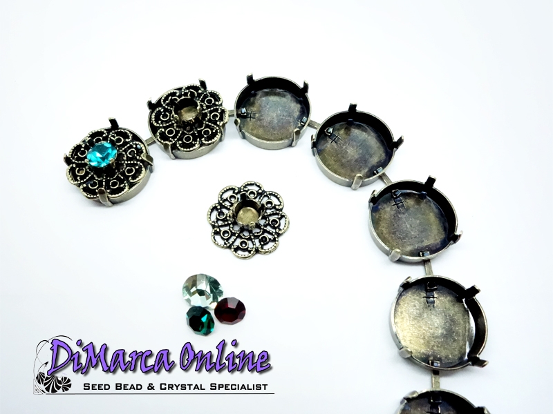 Embedding Elements will enrich your Cup Chain in a very classy way. Instead of a Chaton or Rivoli, you can insert an Embedding Element. It fits exactly in the Empty Cup Chain Settings. These Embedding Elements are made for 6 mm (SS29) Crystal Chatons and fit in 18 mm Empty Cup Chain Settings. The Embedding Elements can be set by bending the 4 prongs gently inwards with pliers.