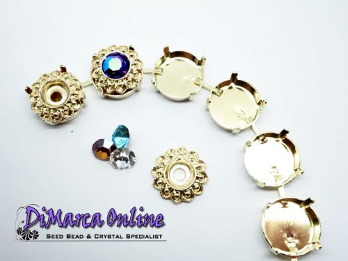 Embedding Elements will enrich your Cup Chain in a very classy way. Instead of a Chaton or Rivoli, you can insert an Embedding Element. It fits exactly in the Empty Cup Chain Settings. These Embedding Elements are made for 6 mm (SS29) Crystal Chatons and fit in 14 mm Empty Cup Chain Settings. The Embedding Elements can be set by bending the 4 prongs gently inwards with pliers. Use glue to embed the chatons in the Embedding Elements.