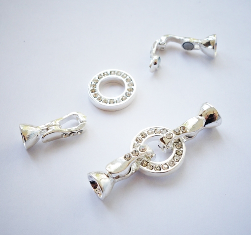 Fold-Over Magnetic Clasp in silver-colour with rhinestones. The two fold-over parts have a magnetic closure, very easy to use. The hole on each side has a middle bar for stringing.