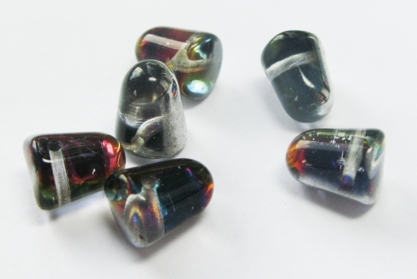 Hand-pressed glass Gumdrop beads with a hole from side to side near the wide end.
