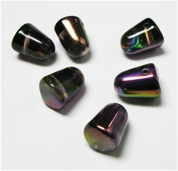 Hand-pressed glass Gumdrop beads with a hole from side to side near the wide end.