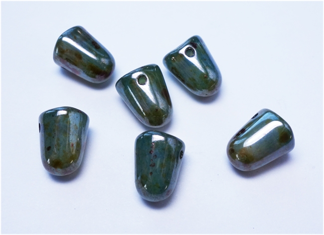 Hand-pressed glass Gumdrop beads with a hole from side to side near the wide end.