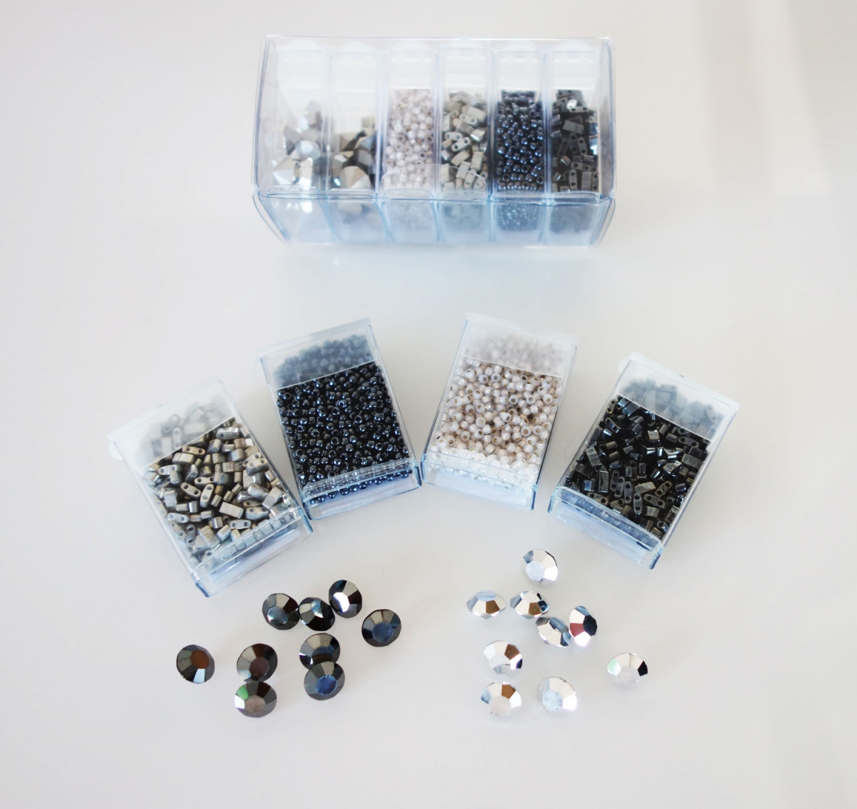 With this pack, you'll have all the beads (Miyuki Tila Half Beads and 11/0 seed beads Miyuki or Toho) & Preciosa Crystal Chatons you need to make at least 2 designs from Akke Jonkhof's "Shiny Mosaic" tutorial serie.