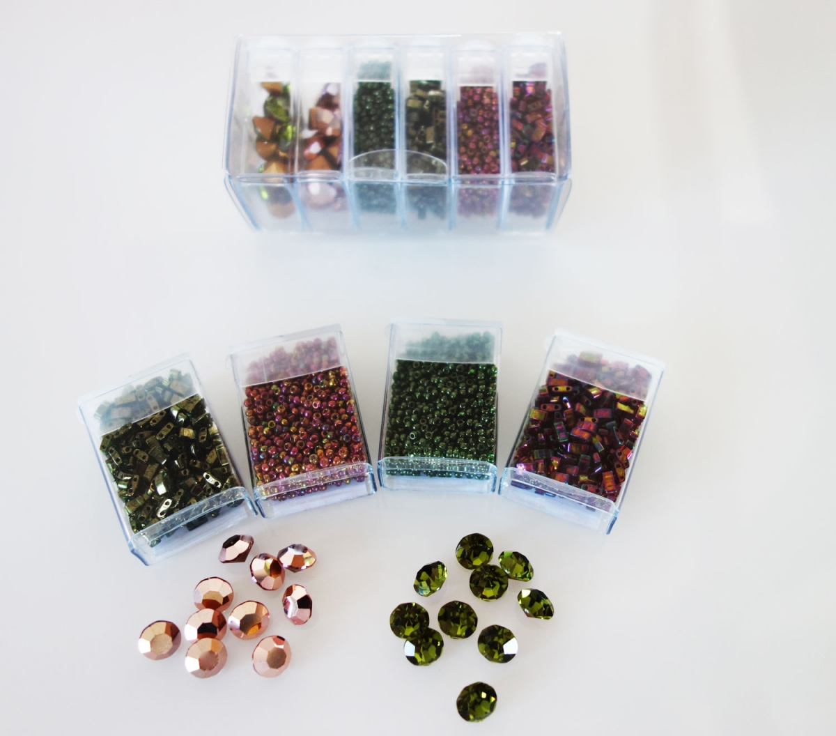 It contains 40 grams beads and 40 Preciosa Crystal chatons of the following colours:
