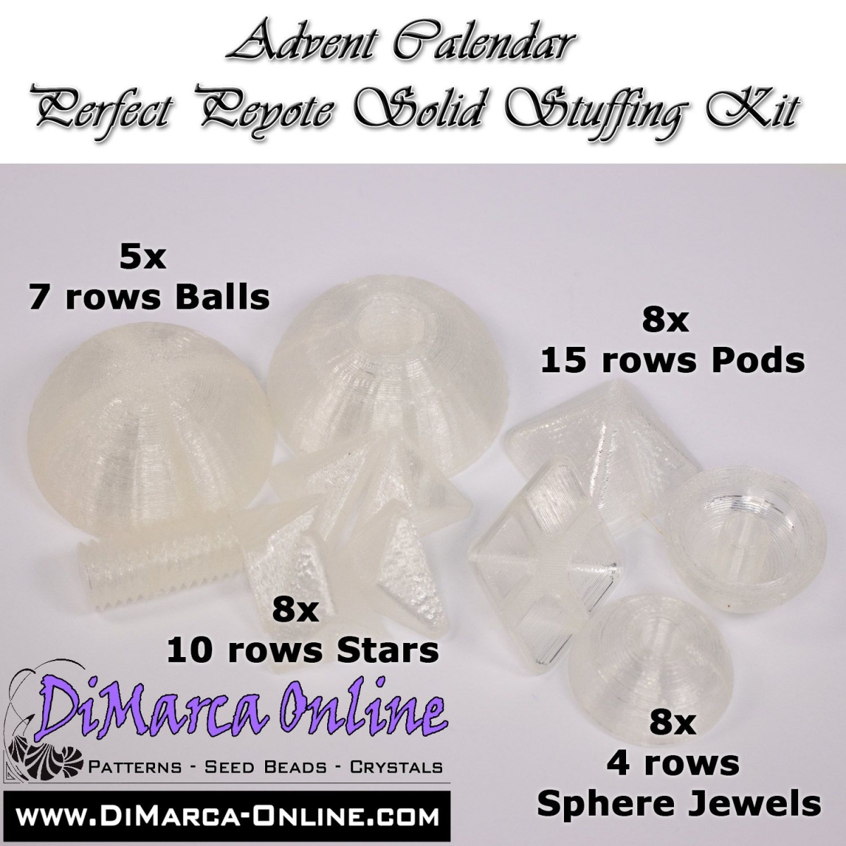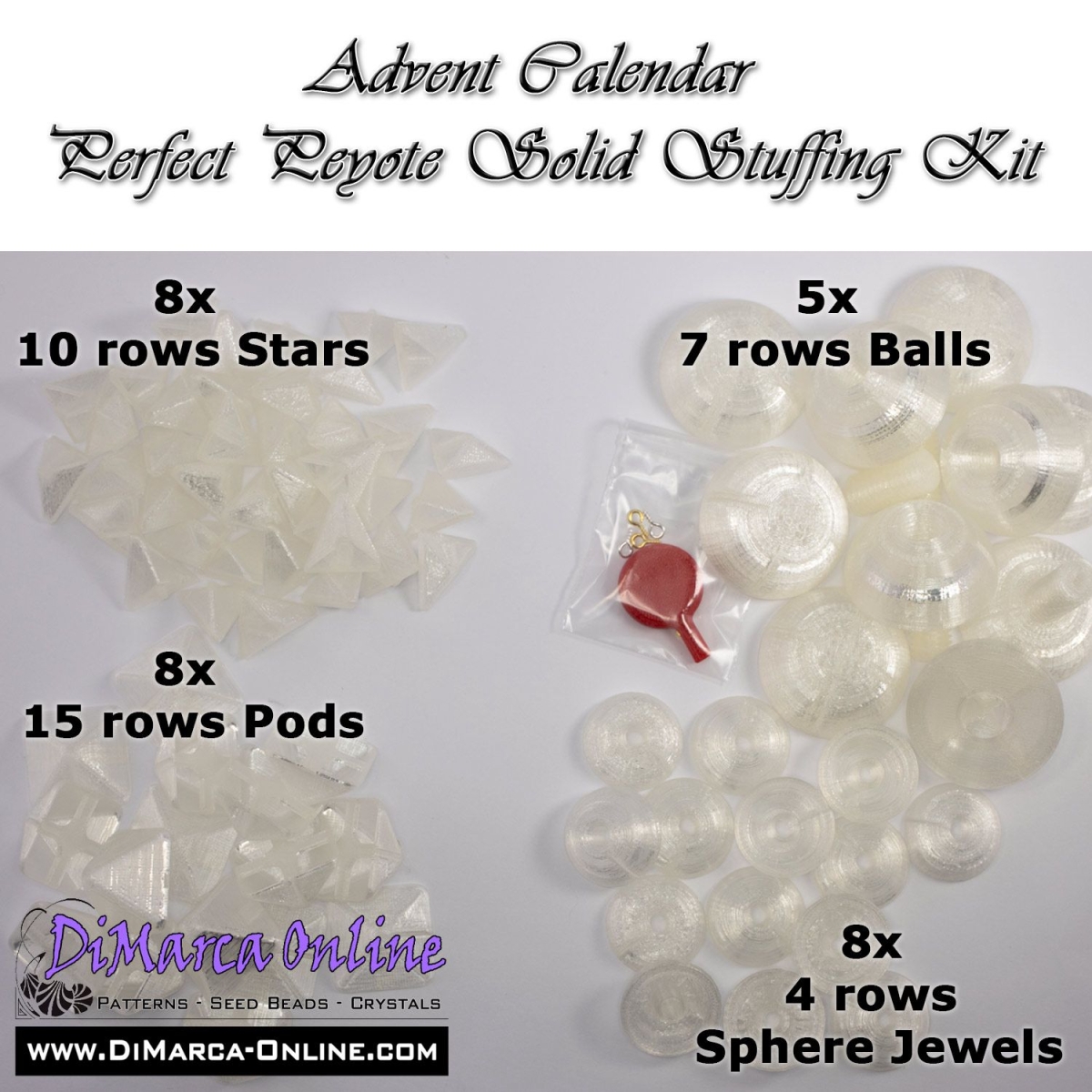 The kit contains all the SOLID STUFFING you need to make the 29 matching Christmas Peyote Ball, Star & Pod Patterns of the Digital Advent Calendar 2025.