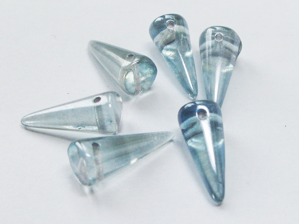 Pointy hand-pressed glass Spike beads with a hole from side to side near the wide end.