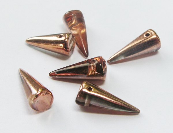 Pointy hand-pressed glass Spike beads with a hole from side to side near the wide end.
