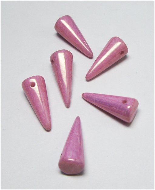 Pointy hand-pressed glass Spike beads with a hole from side to side near the wide end.