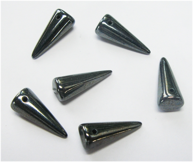 Pointy hand-pressed glass Spike beads with a hole from side to side near the wide end.