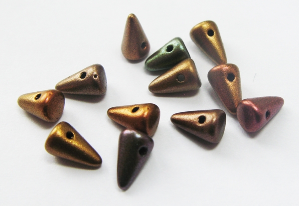 Pointy hand-pressed glass Spike beads with a hole from side to side near the wide end.