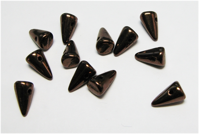 Pointy hand-pressed glass Spike beads with a hole from side to side near the wide end.