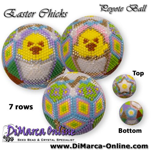 This beading pattern provides colour diagrams and word charts to create the EASTER CHICKS 3D Peyote Ball.