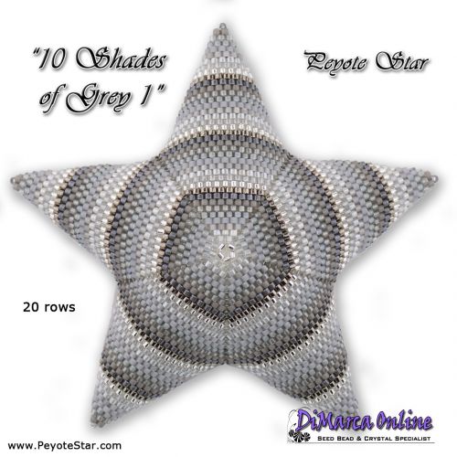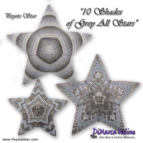 This beading pattern provides a colour diagram and word chart to create the 3 x 10 SHADES OF GREY Peyote Stars: 10 Shades of Grey 1, 2 and 3.