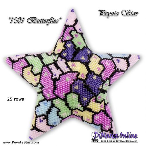 This beading pattern provides a colour diagram and word chart to create the 1001 BUTTERFLIES Peyote Star.