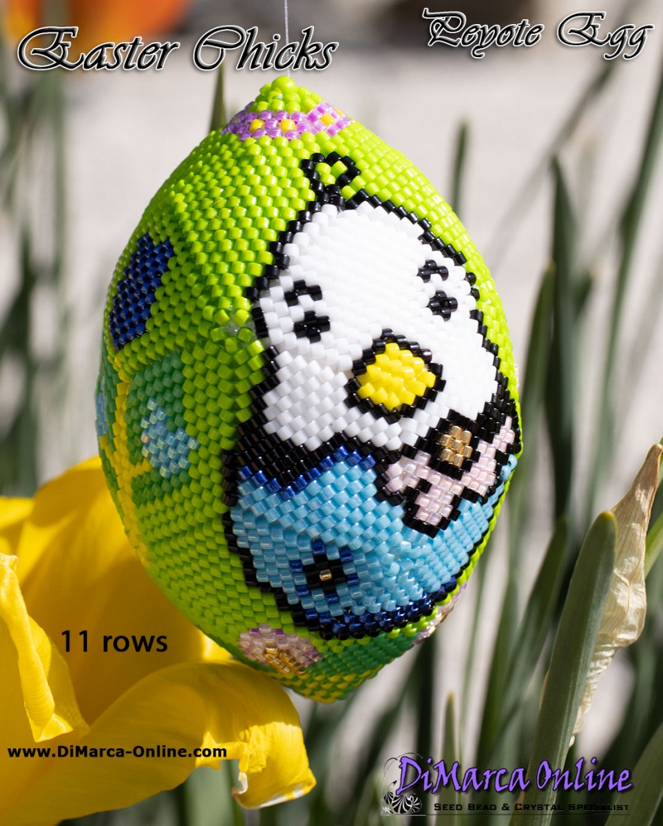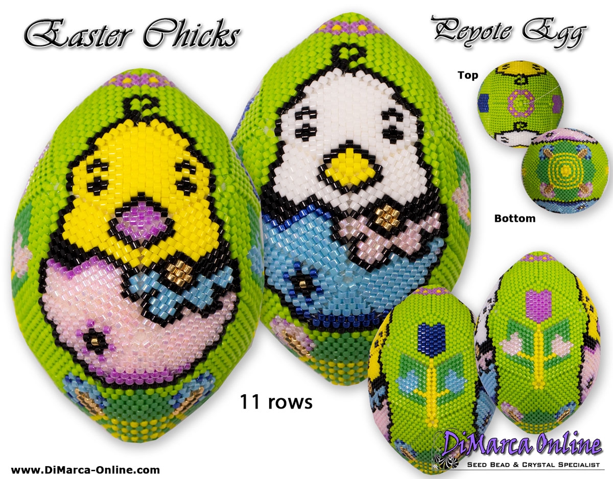 This beading pattern provides colour diagrams and word charts to create the EASTER CHICKS 3D Peyote Egg.