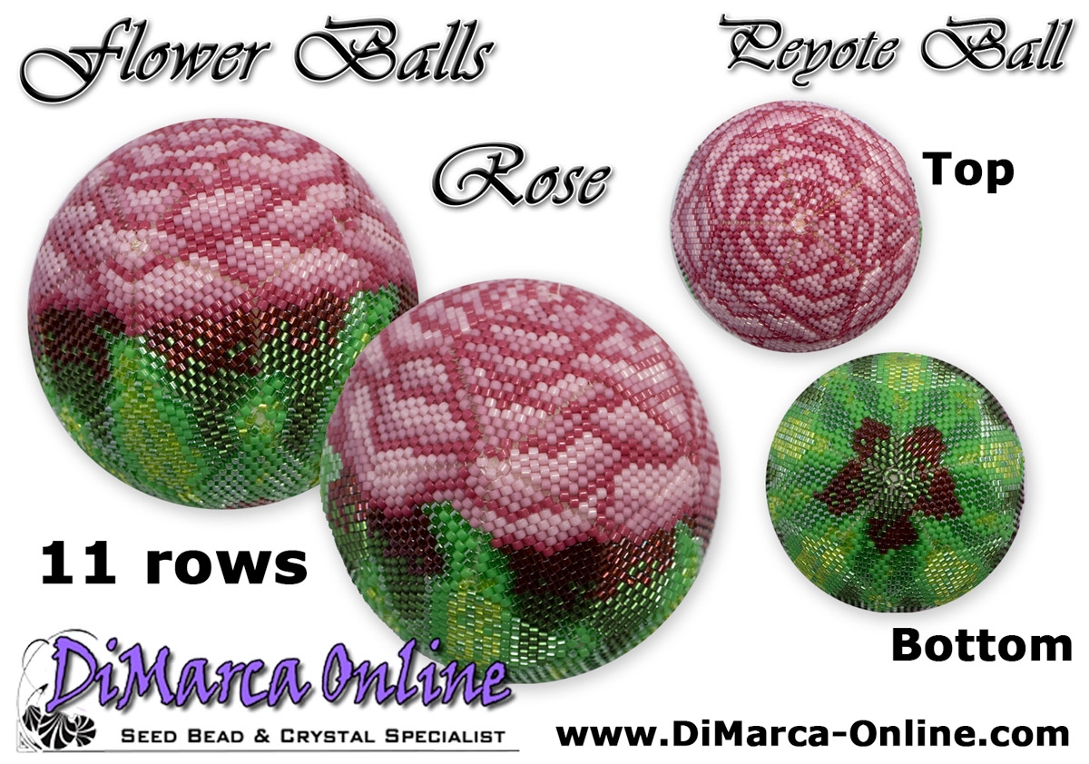 This beading pattern provides colour diagrams and word charts to create the ROSE 3D Peyote Ball.