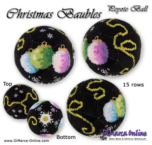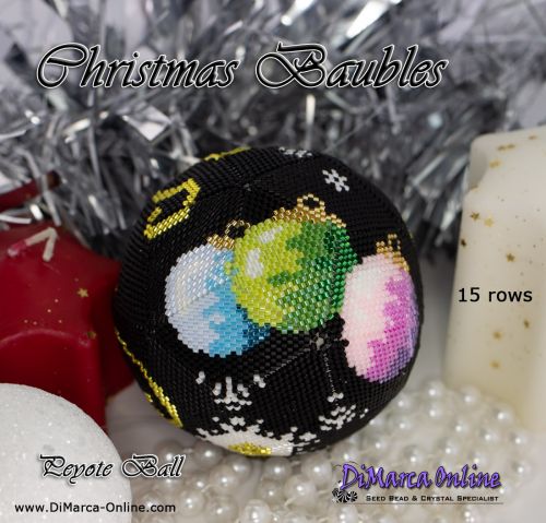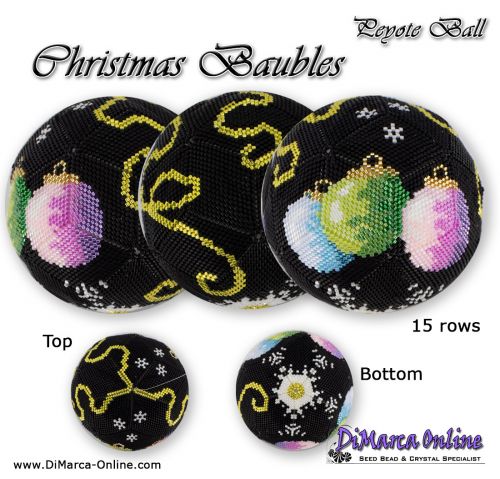 This beading pattern provides colour diagrams and word charts to create the CHRISTMAS BAUBLES 3D Peyote Ball.