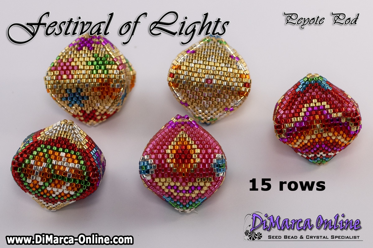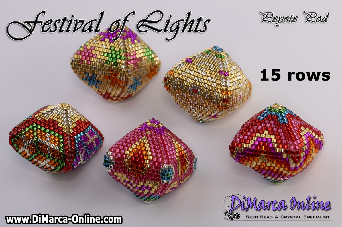 This beading pattern provides colour diagrams and word charts to create the 5 FESTIVAL OF LIGHTS 3D Peyote Pods.