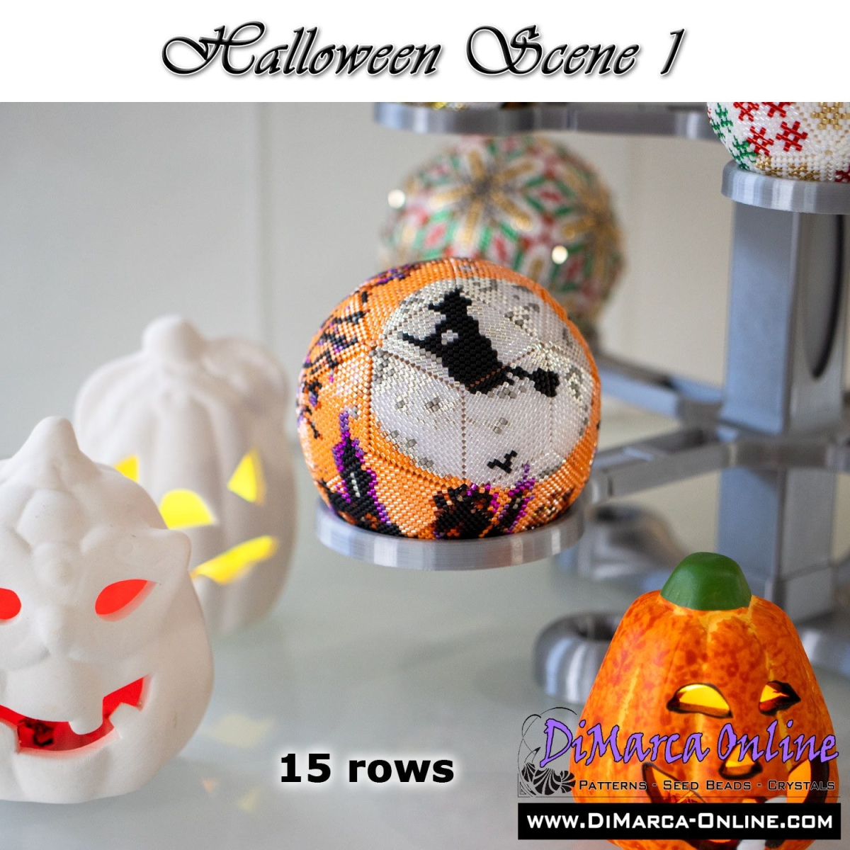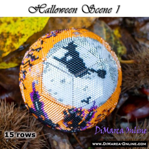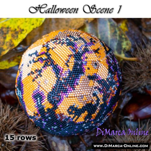 This beading pattern provides colour diagrams and word charts to create the HALLOWEEN SCENE 1 - 3D Peyote Ball.