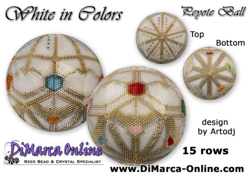 This beading pattern provides colour diagrams and word charts to create the WHITE IN COLORS 3D Peyote Ball.