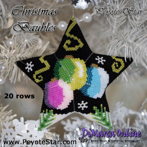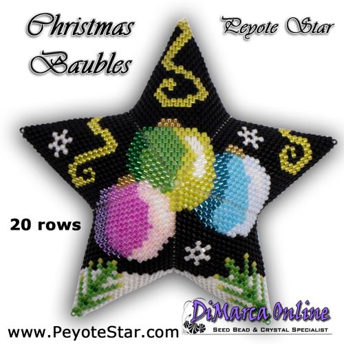 This beading pattern provides a colour diagram and word chart to create the CHRISTMAS BAUBLES Peyote Star.