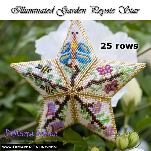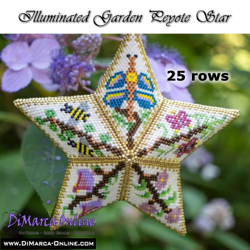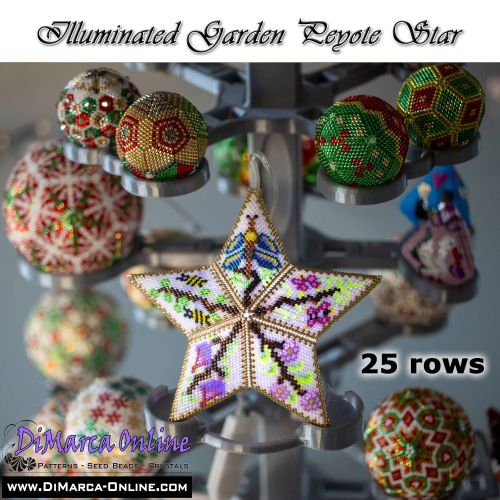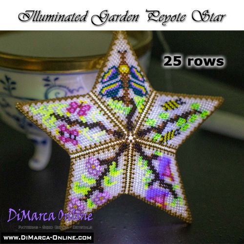 This beading pattern provides a colour diagram and word chart to create the ILLUMINATED GARDEN 3D Peyote Star.
