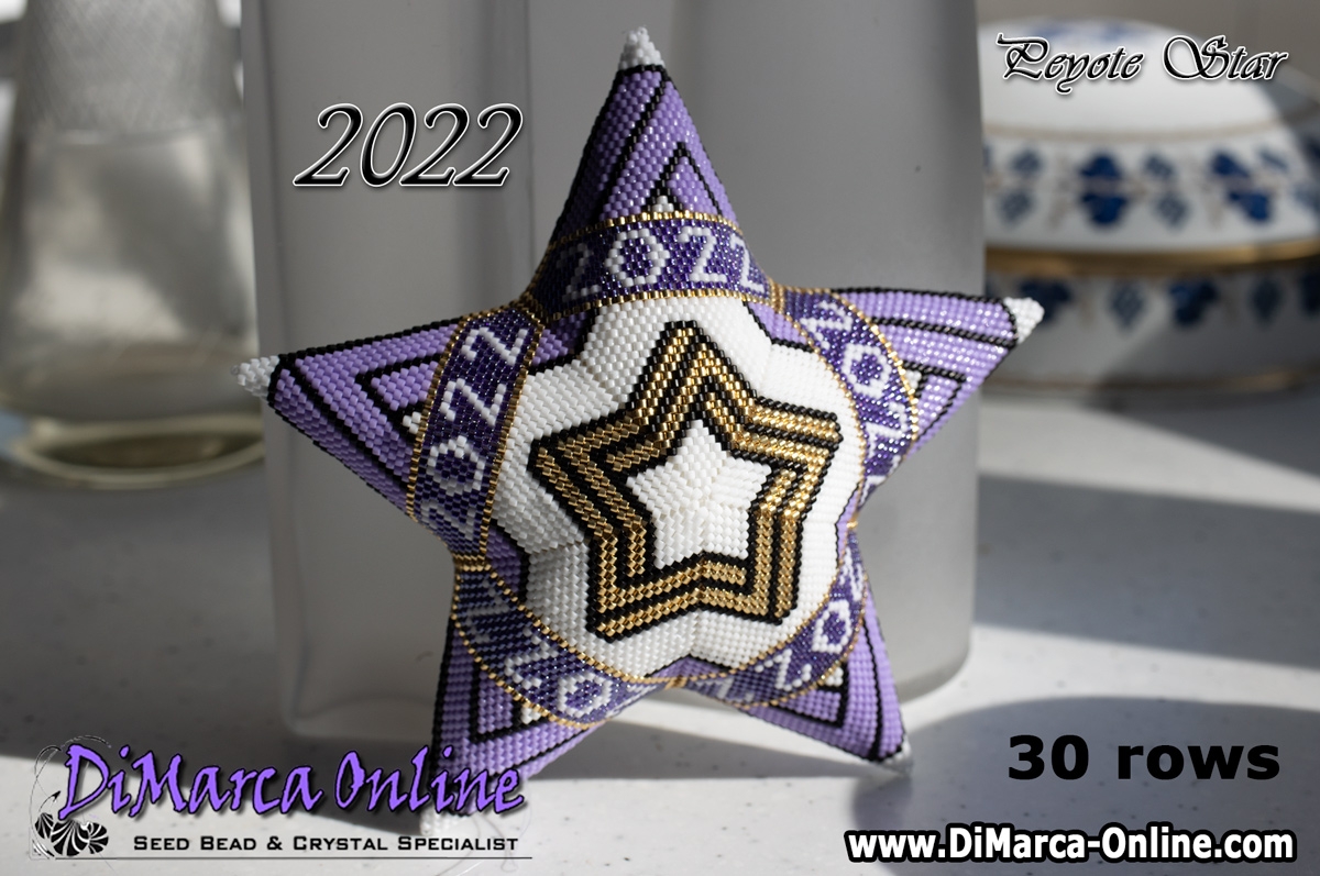 This beading pattern provides a colour diagram and word chart to create the 2022 3D Peyote Star.