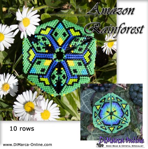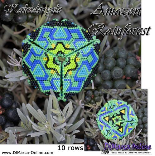 This beading pattern provides colour diagrams and word charts to create the AMAZON RAINFOREST 3D Kaleidocycle in 3 colourways (blue/green, purple/pink and red/orange).