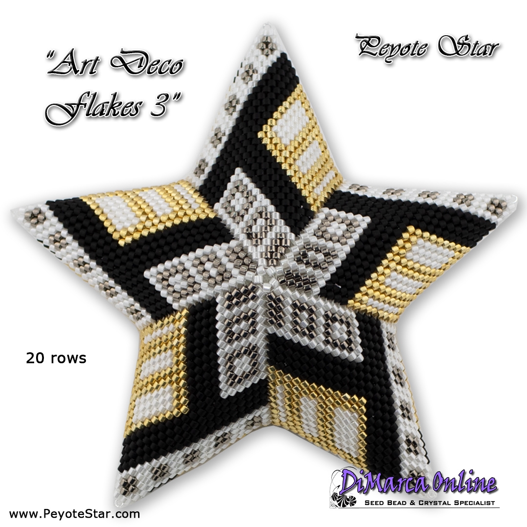 This beading pattern provides a colour diagram and word chart to create the 3 ART DECO FLAKES Peyote Stars: Art Deco Flakes 1, 2 and 3.