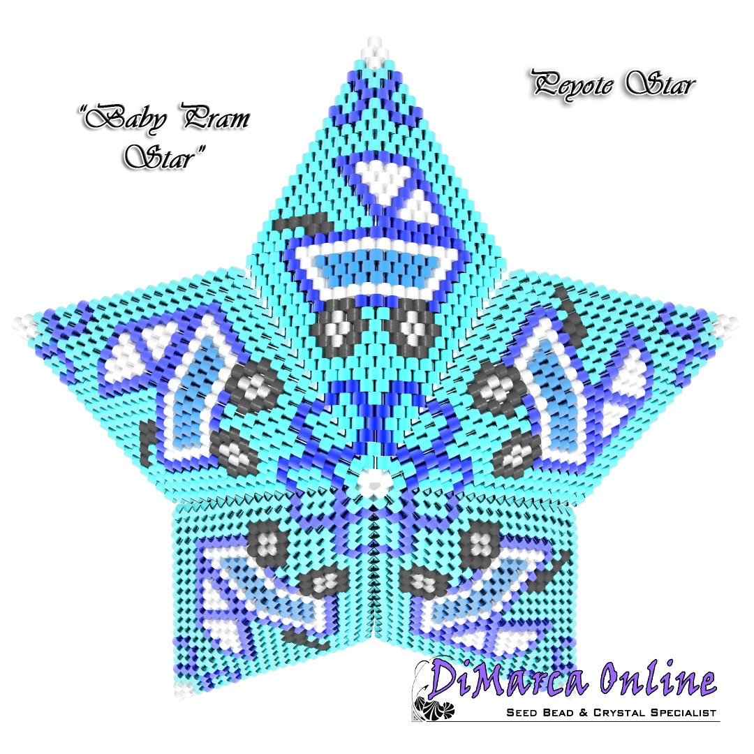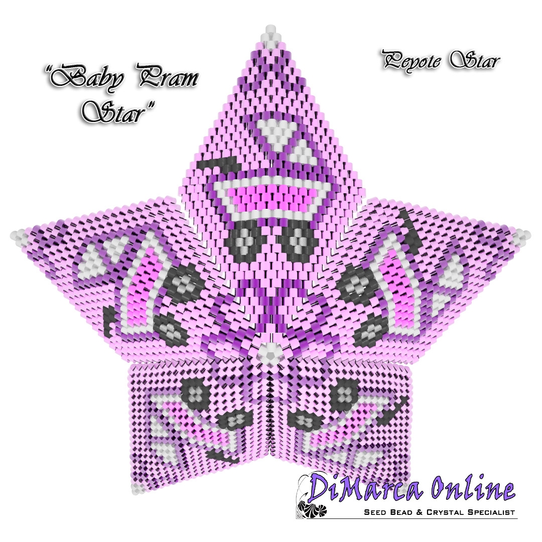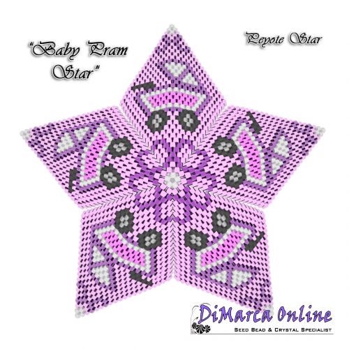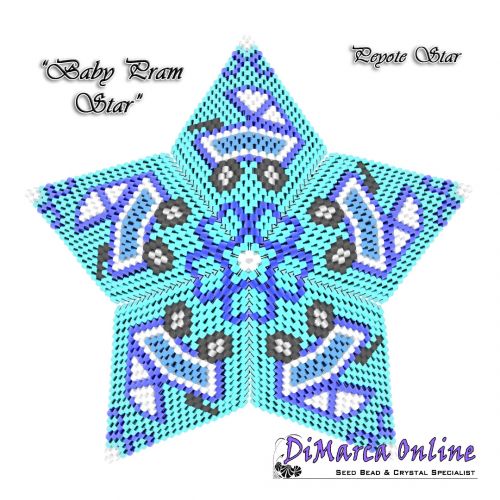 This beading pattern provides a colour diagram and text to create the Baby Pram 3D Peyote Star.