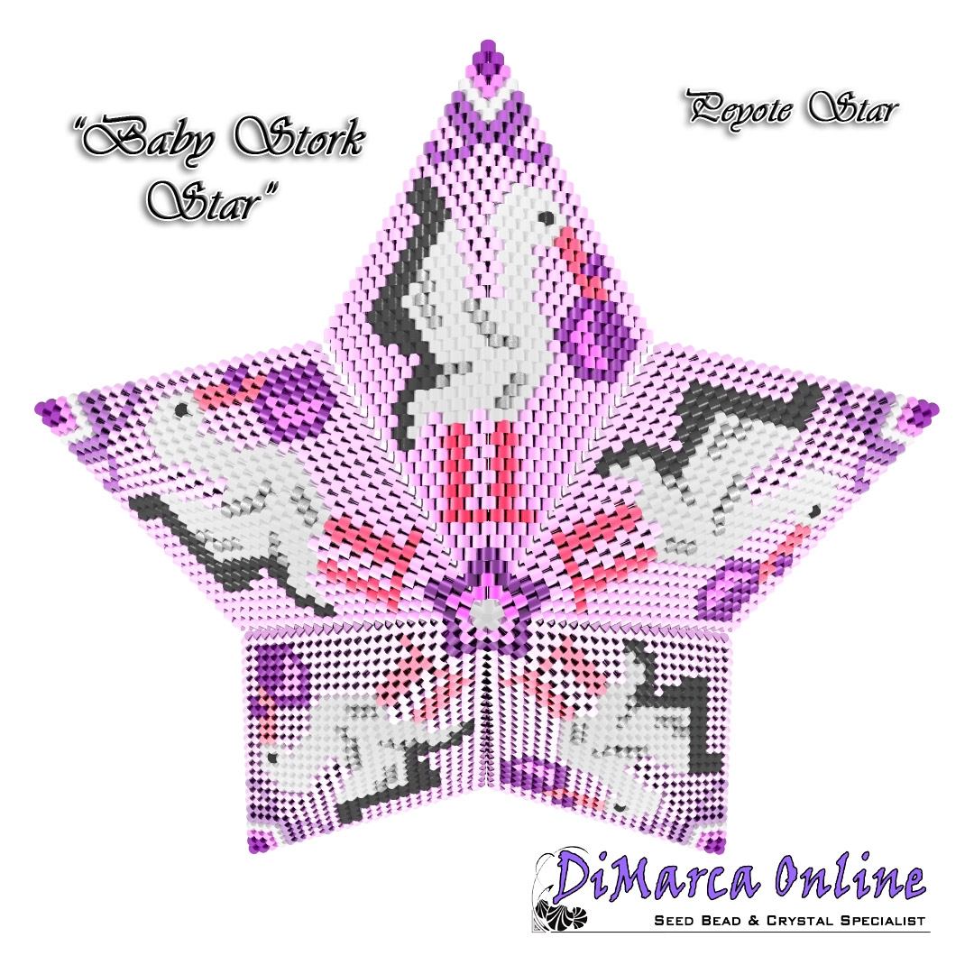 This beading pattern provides a colour diagram and text to create the Baby Stork 3D Peyote Star.