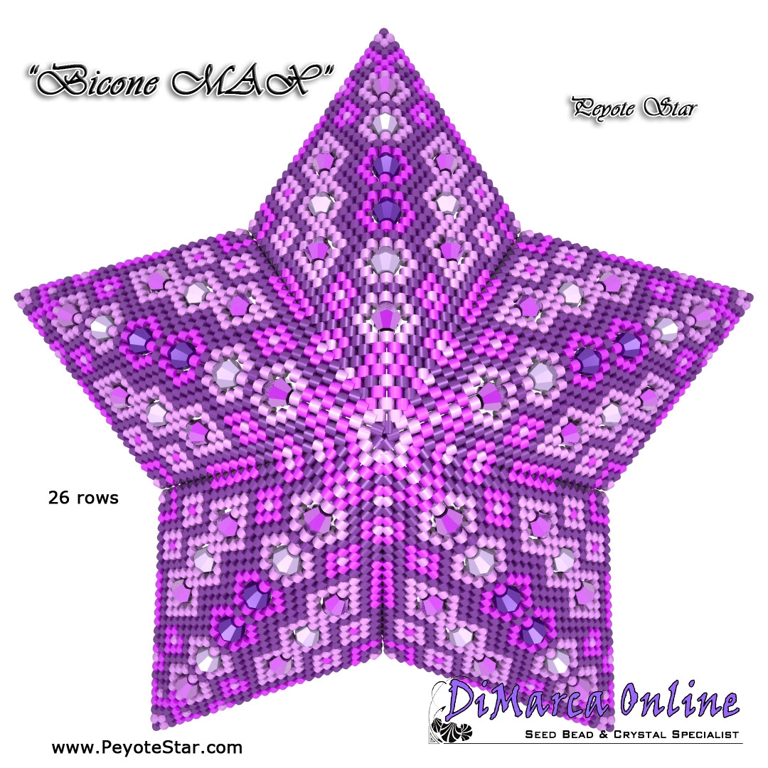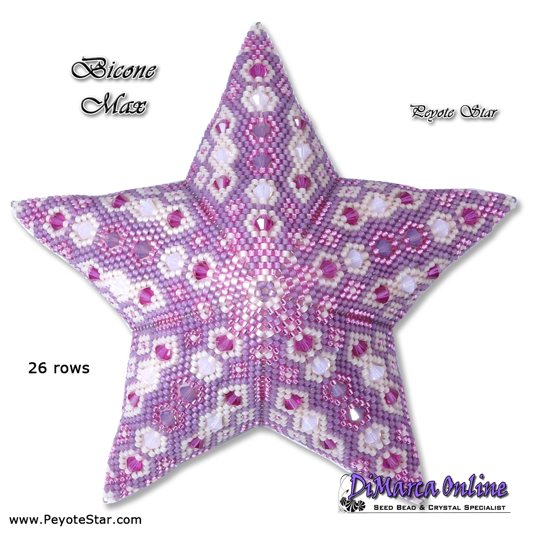 This beading pattern provides a colour diagram and word chart to create the BICONE MAX 3D Peyote Star.