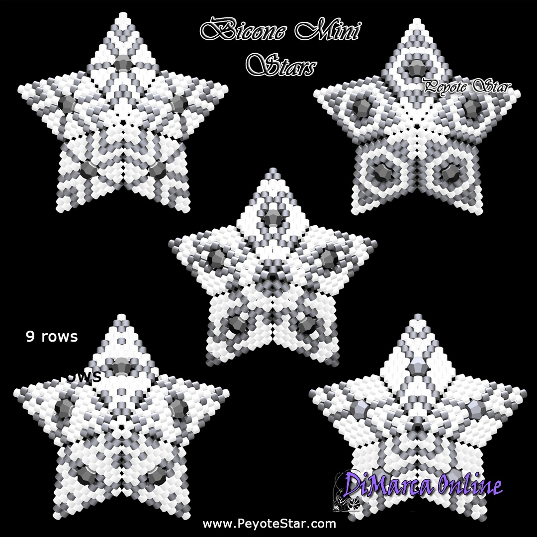 This beading pattern provides colour diagrams and word charts to create the 5 BICONE MINI Peyote Stars.