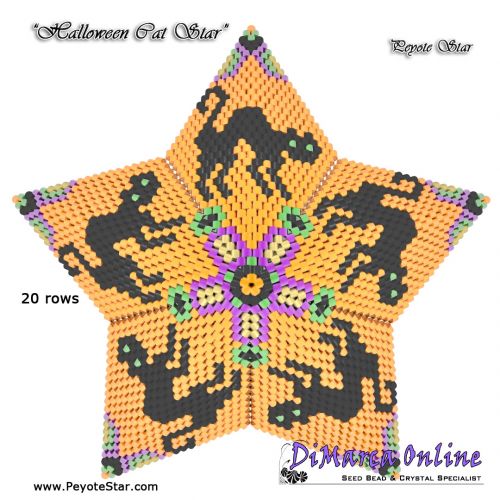 This beading pattern provides a colour diagram and word chart to create the 3 CATS 3D Peyote Stars: Cat-O-Rama, Halloween Cat and Silhouette Cat star.