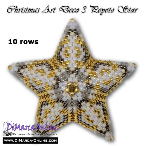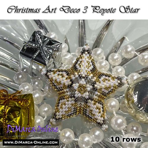 This beading pattern provides colour diagrams and word charts to create the CHRISTMAS ART DECO 3 - 3D Peyote Star.