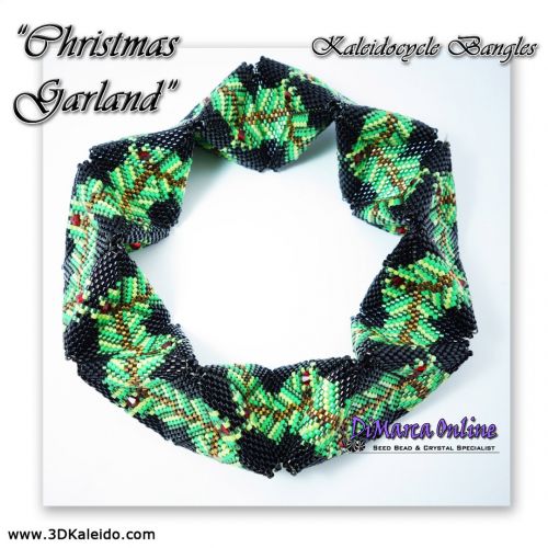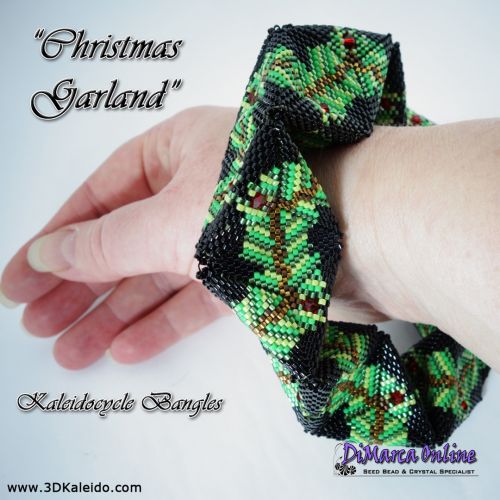 This beading pattern provides colour diagrams and word charts to create 2 KALEIDOCYCLE BANGLES: CHRISTMAS GARLAND and SWIRL 3D Kaleidocycle Bangle.