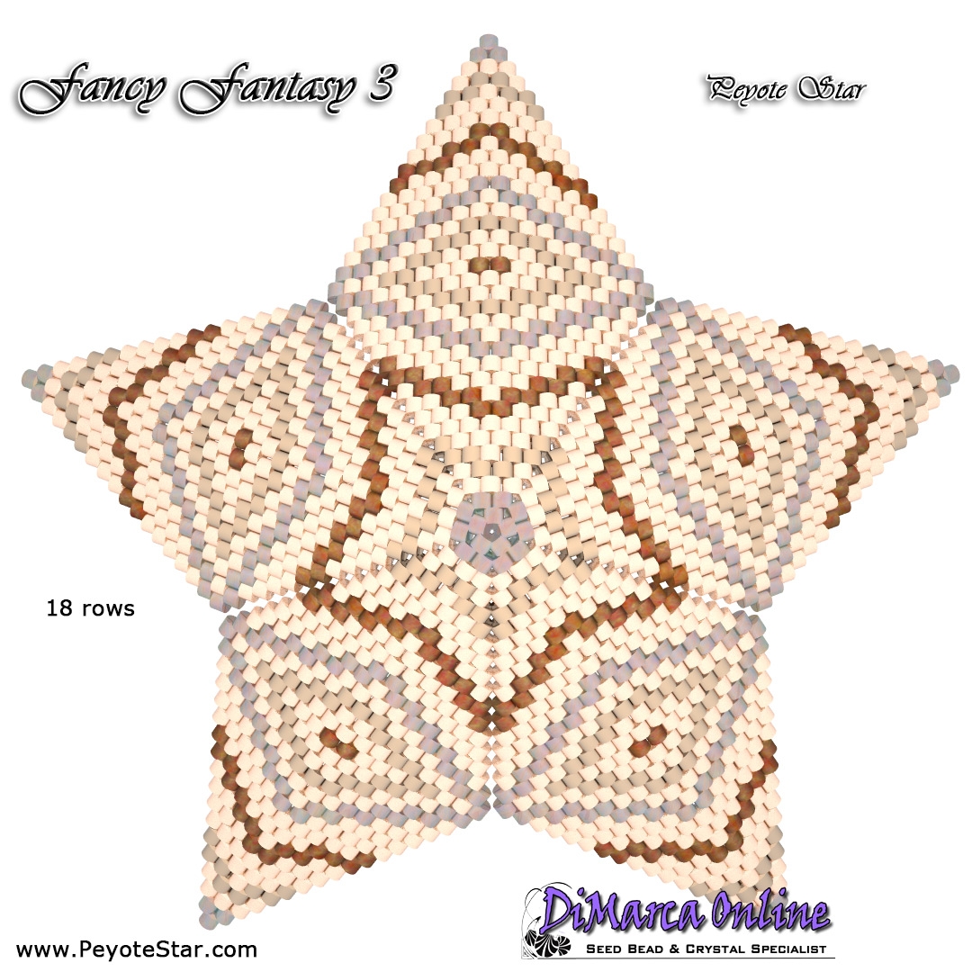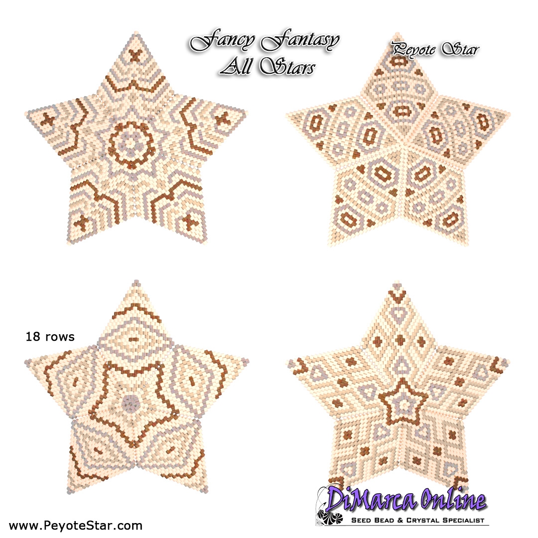 This beading pattern provides a colour diagram and word chart to create the 4 FANCY FANTASY Peyote Stars: Fancy Fantasy 1, 2, 3 and 4.