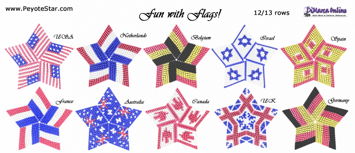 This beading pattern provides colour diagrams and word charts to create the 10 FLAGS ALL STARS Peyote Stars: Australia, Belgium, Canada, France, Germany, Israel, Spain, The Netherlands, UK and USA Flag.