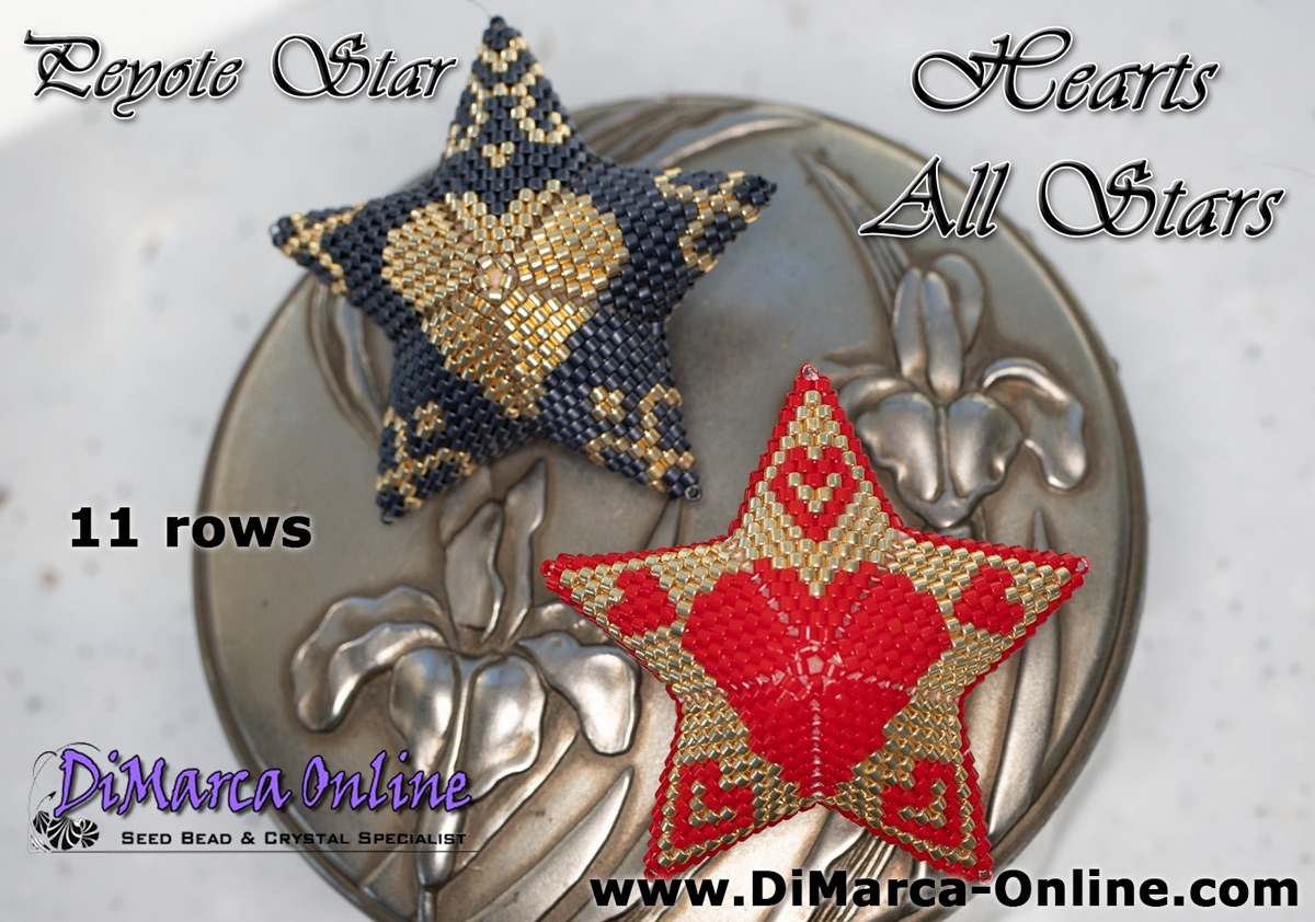 This beading pattern provides a colour diagram and word chart to create the 2 HEARTS 3D Peyote Stars: FLAMING HEART and VICTORIAN HEART Star.