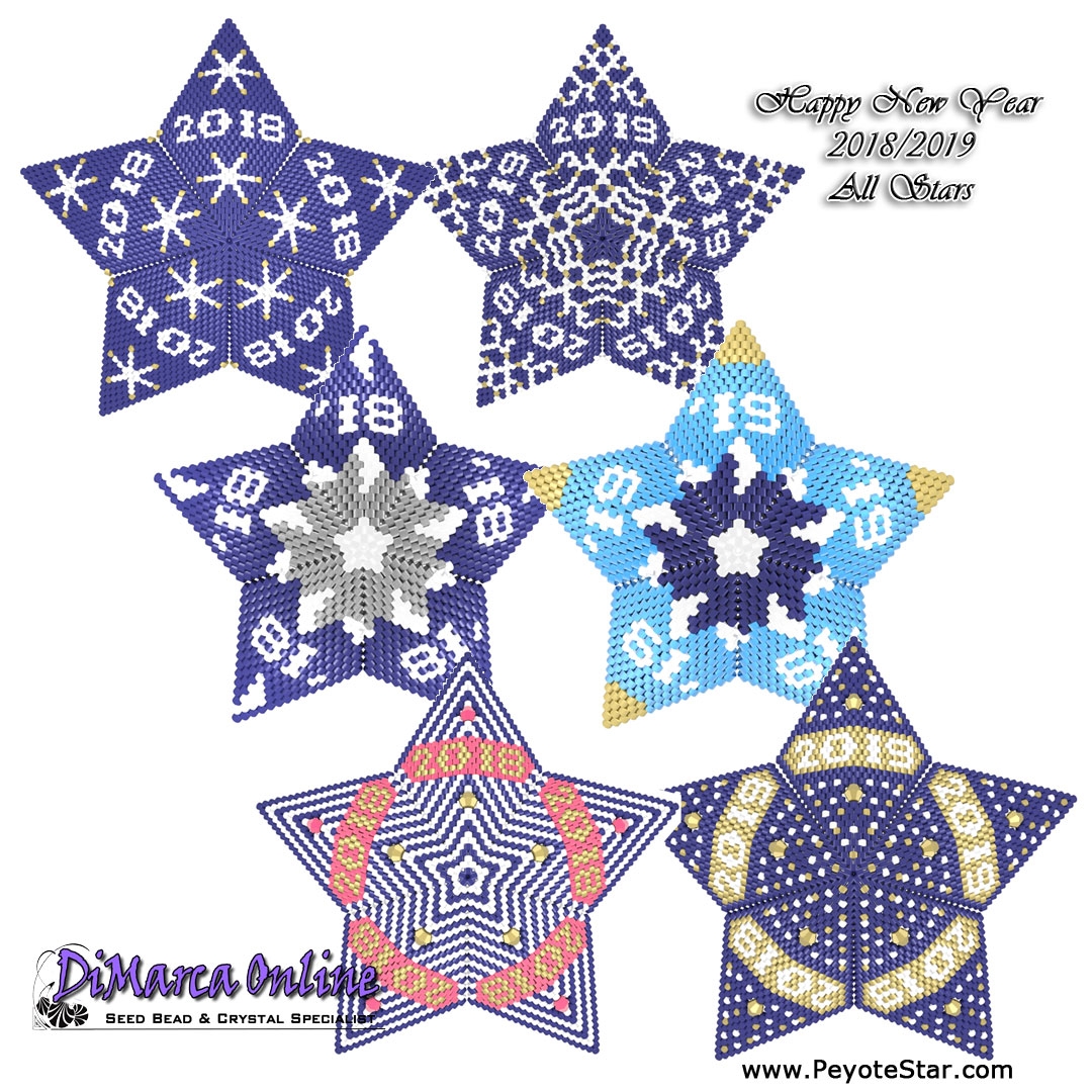 This beading pattern provides a colour diagram and word chart to create the 3 HAPPY NEW YEAR 2018/2019 3D Peyote Stars: HAPPY NEW YEAR 2018/2019 Star 1, 2 and 3.