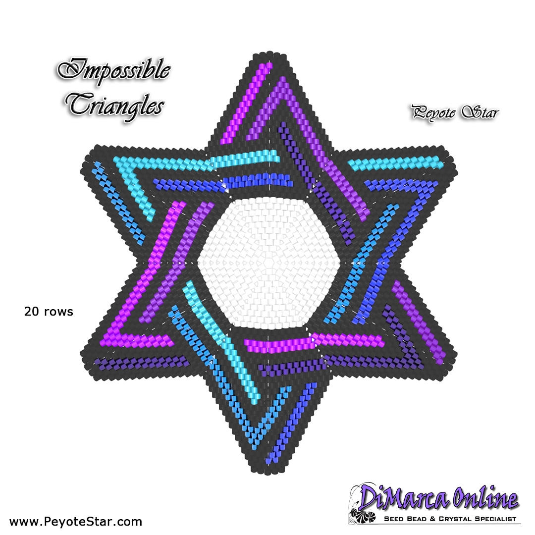 This beading pattern provides a colour diagram and word chart to create the IMPOSSIBLE TRIANGLES 3D Peyote Star.