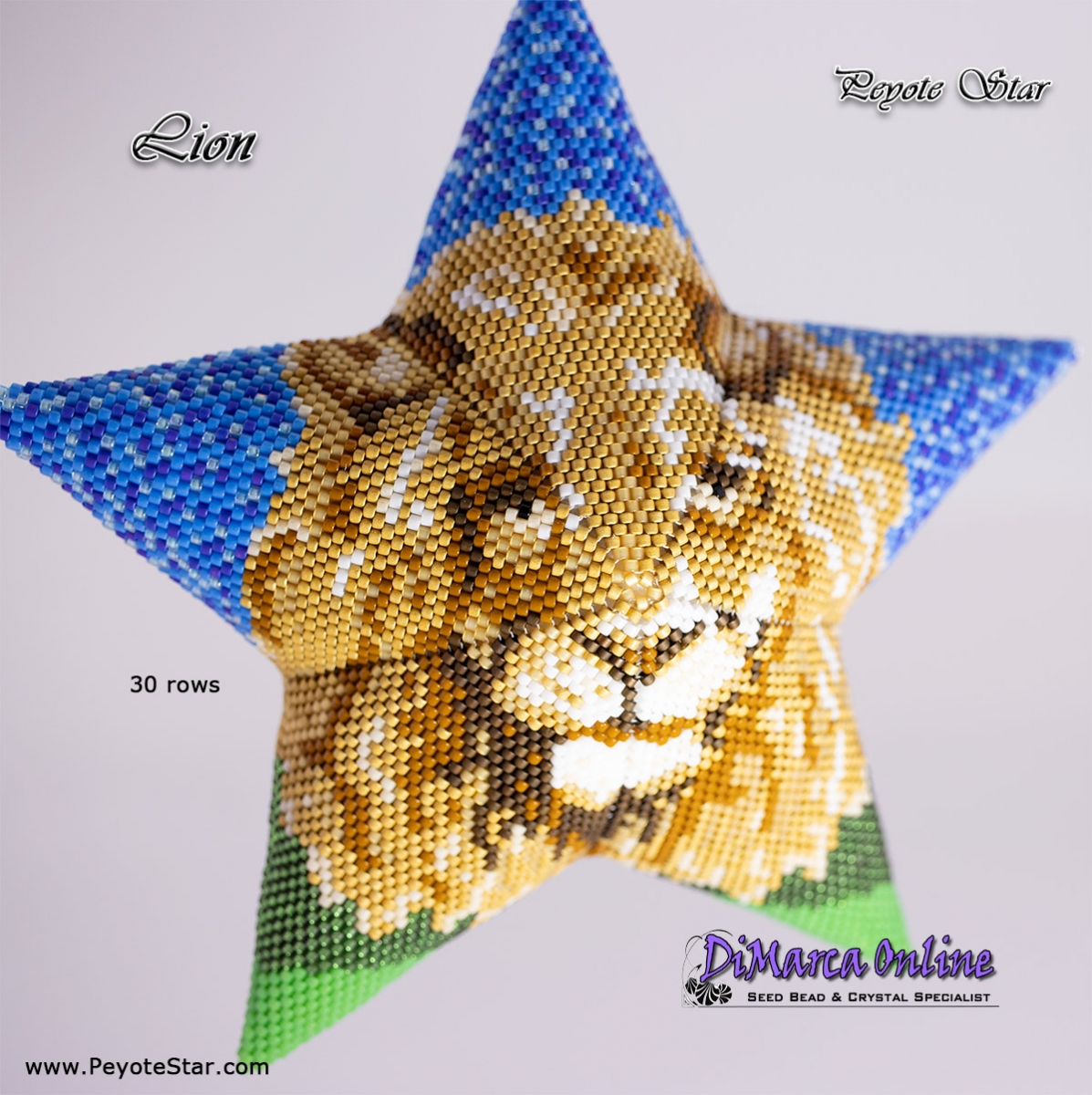 This beading pattern provides a colour diagram and word chart to create the LION 3D Peyote Star.