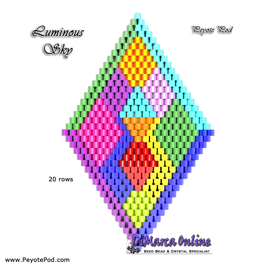 This beading pattern provides a colour diagram and word chart to create the LUMINOUS SKY 3D Peyote Pod.