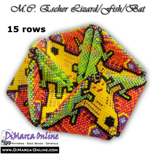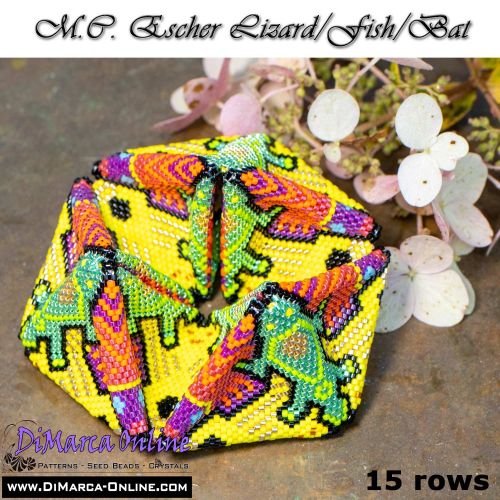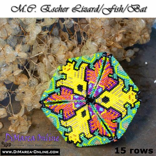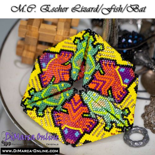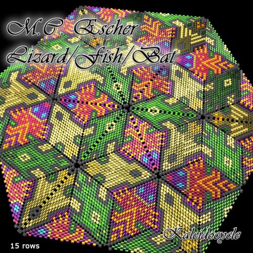 This beading pattern provides colour diagrams and word charts to create the M.C. ESCHER LIZARD/FISH/BAT 3D Kaleidocycle.
