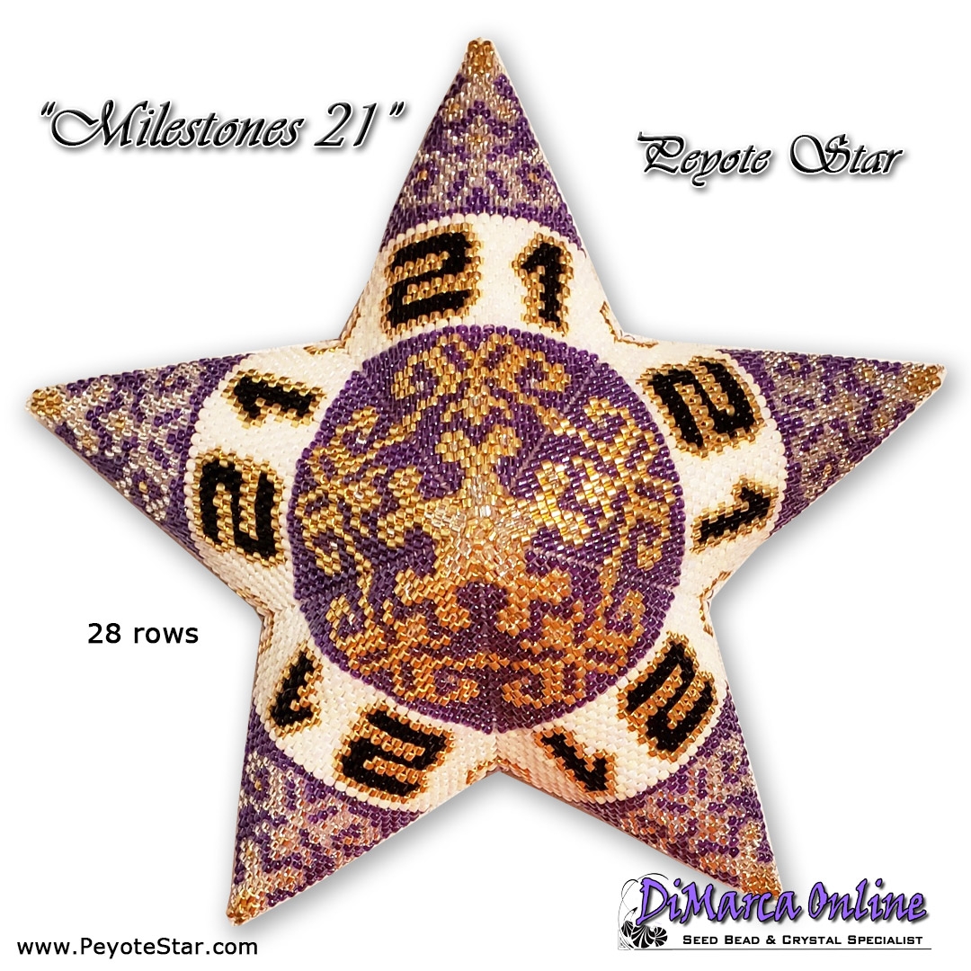 This beading pattern provides a colour diagram and word chart to create the MILESTONES 21 - Peyote Star.
